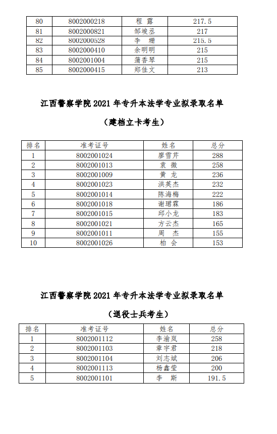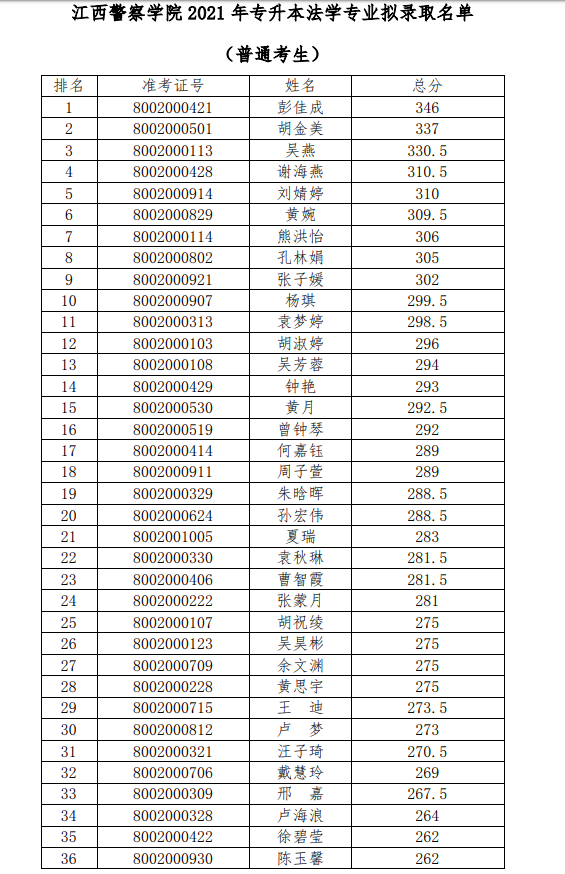 附件:江西警察学院2021年专升本法学专业拟录取名单