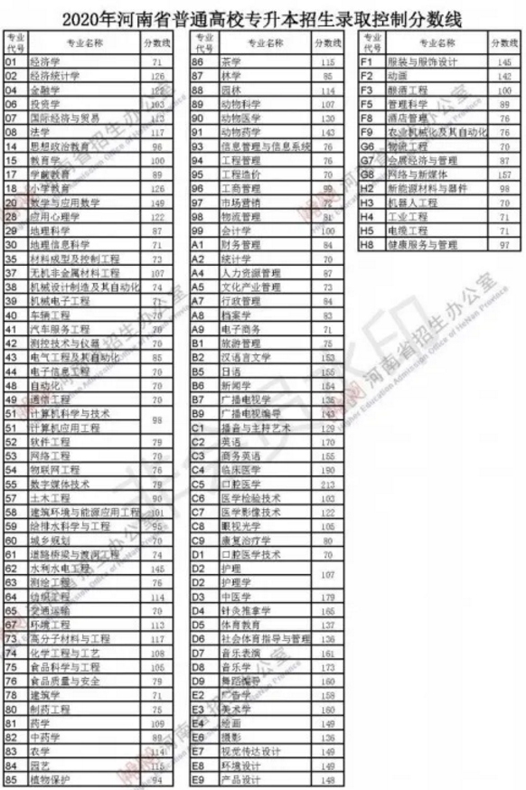 以下为2020年河南专升本录取控制分数线,供大家参考: