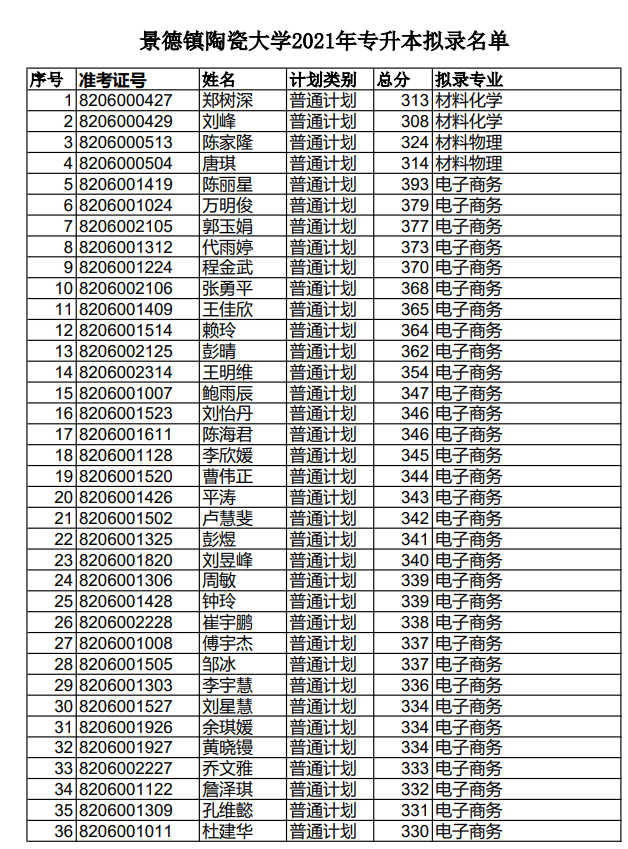 根据省教育厅《江西省2021年普通高校专升本考试招生实施方案》、《江西省高等职业院校与本科高校联合培养本科层次技术技能型人才实施方案》、《景德镇陶瓷大学2021年专升本招生简章》等通知文件精神,经研究决定,报江西省教育厅考试院审核,现将2021年我校专升本拟录取名单予以公示(详见附件)。如有异议,请与6月29日17:00前将存在异议内容的文字说明和本人准考证扫描件发送至tyzsb@vip.163.com,逾期不再受理。