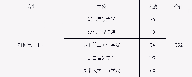 湖北专升本中,有机械电子工程专业专升本招生计划的院校一共有5所,招生人数共392人。