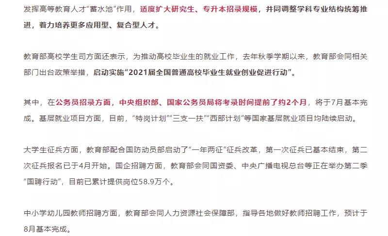 “研究生再次扩招,适度扩大研究生、专升本招录规模,把升学扩招同调整学科专业结构统筹推进,着力培养更多应用型、复合型的人才。”