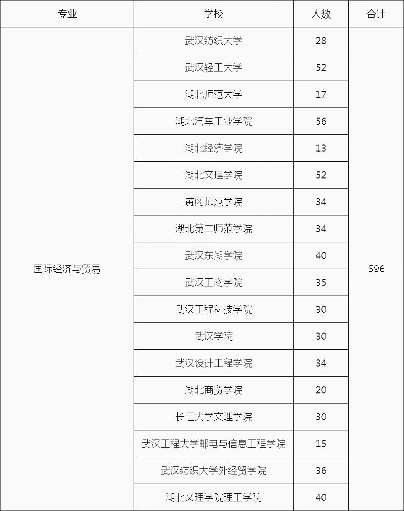 湖北专升本中,有国际经济与贸易专业专升本招生计划的院校一共有18所,招生人数共596人。