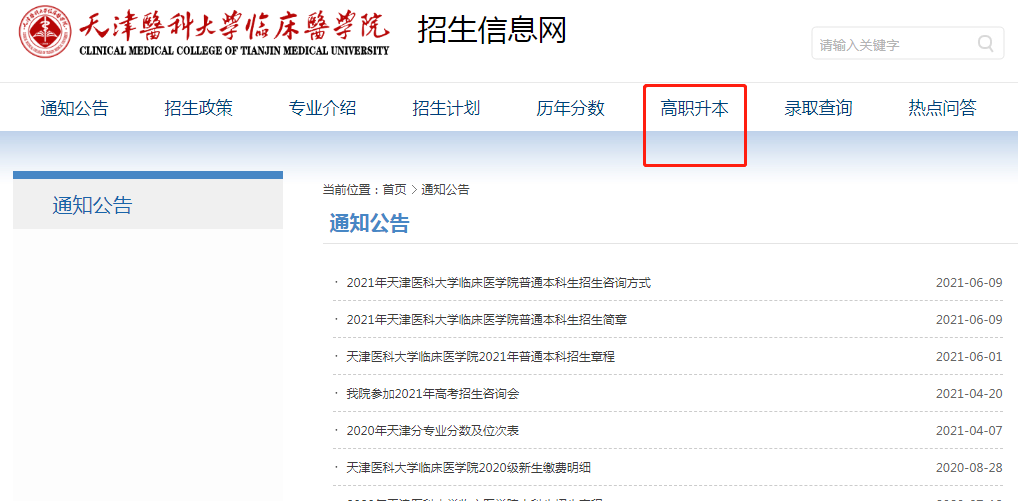 天津医科大学临床医学院招生信息网专升本资讯栏目