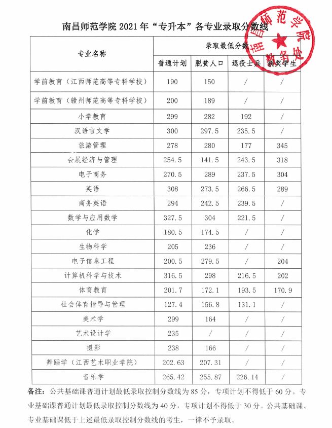 2021年南昌师范学院专升本录取最低控制线:公共基础课普通计划最低录取控制分数线为85分,专项计划不得低于60分。专业基础课普通计划最低录取控制分数线为40分,专项计划不得低于30分。公共基础课、专业基础课低于上述最低录取控制分数线的考生,一律不予录取。