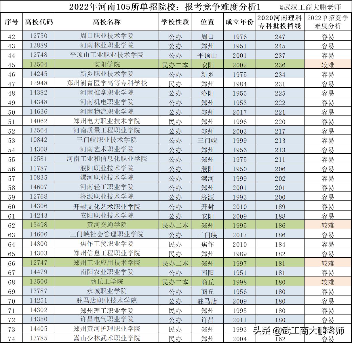 以下大鹏老师参考河南2020年理科专科批次投档线(2021河南没有公布专科批次投档线);对这105所单招院校报考难度进行如下分析。