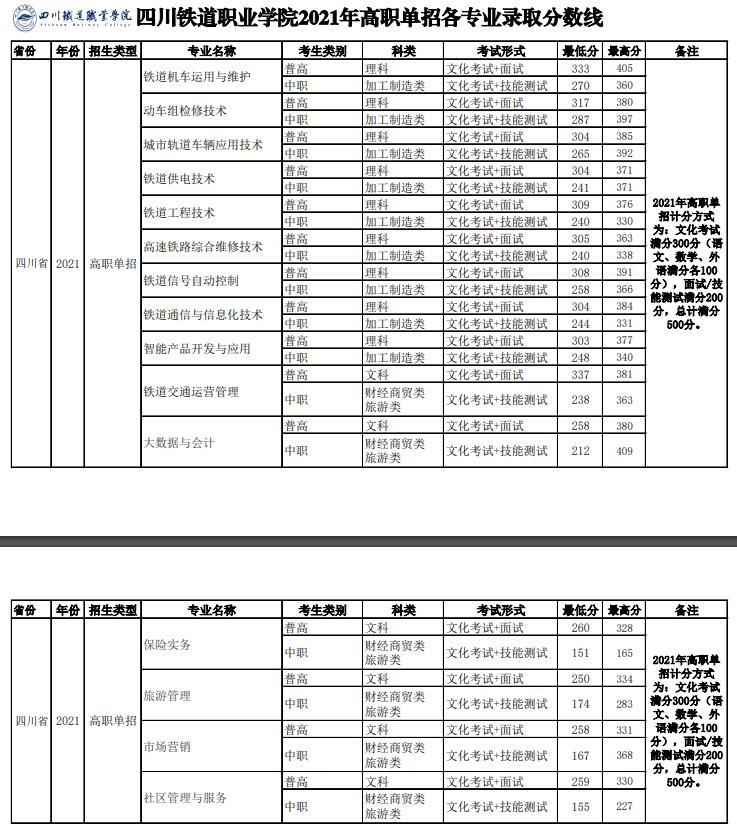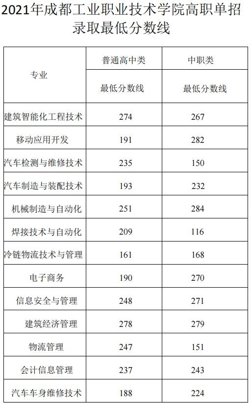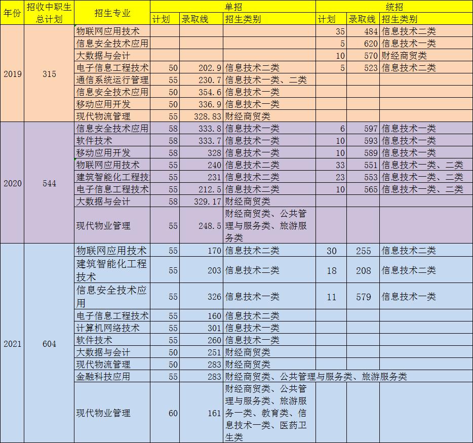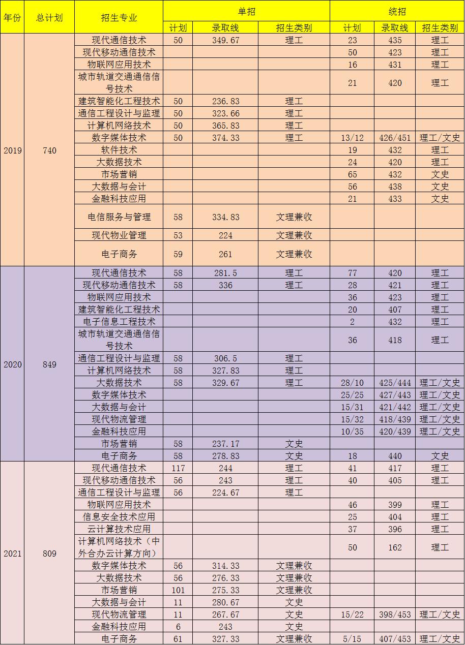 学院高职单招普高类招生2019年录取最低分数线224分(现代物业管理专业);2020年录取最低分数线237.17分(市场营销专业);2021年录取最低分数线224.67分(通信工程设计与监理专业)。