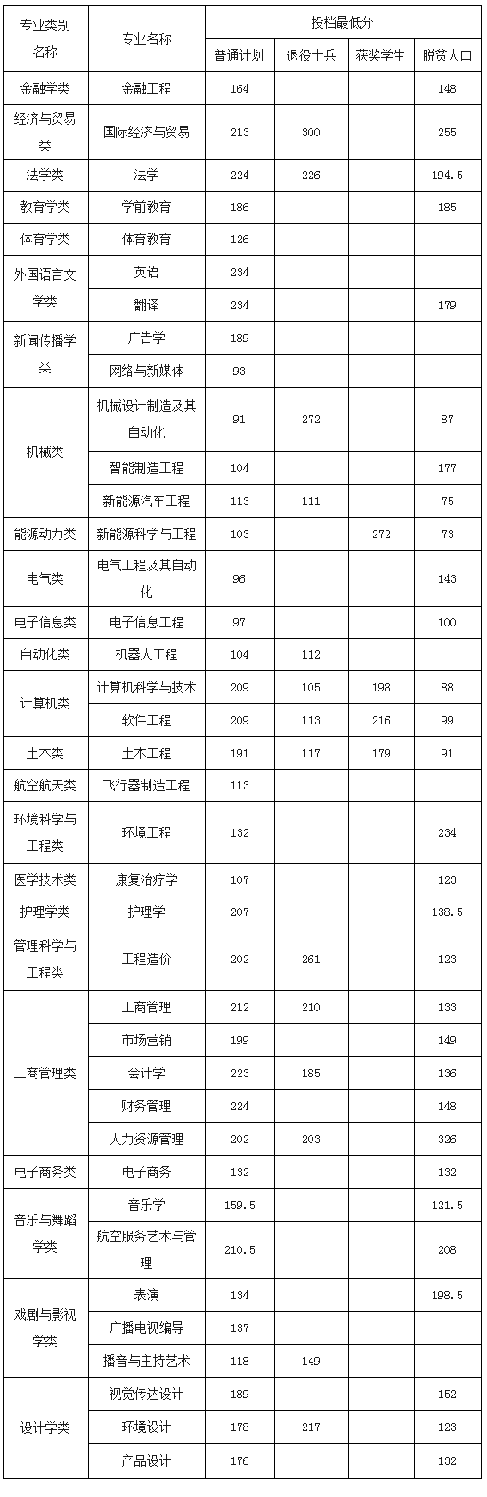 各专业按计划类别预录取分数线情况如下: