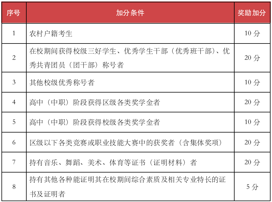 考生符合下列条件之一,可获得奖励加分,不同类型的奖励加分可累加计算,但最多按50分纳入总成绩评定。