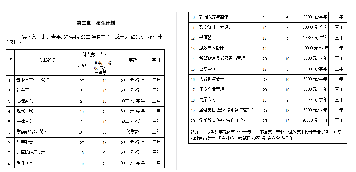 第七条 北京青年政治学院 2022 年自主招生总计划 480 人,招生计划如下: