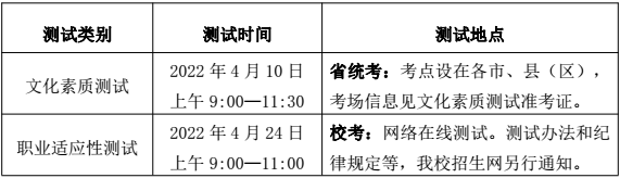 3.校考安排:缴费成功的考生于2022年4月23日进行校考网络在线测试平台登录演练,4月24日进行职业适应性测试。具体测试办法和纪律规定另行发布,详见我校招生网和招生微信公众号。