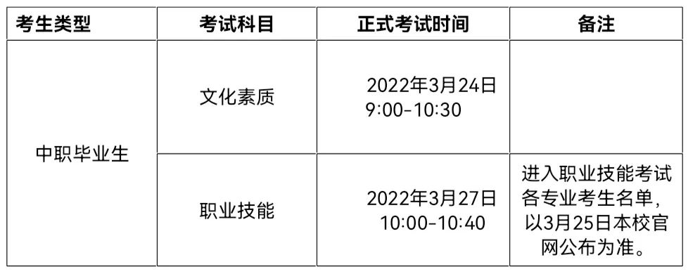 中职毕业生考生,实行“文化素质+职业技能”评价方式。文化素质考试结束后,根据考生文化素质考试成绩,本校按招生计划3倍的比例,于本校官网公布进入职业技能考试的考生名单。