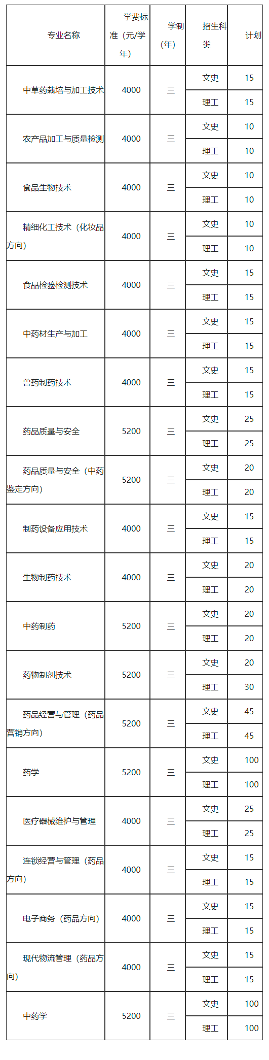 三、单招专业、计划及学费标准