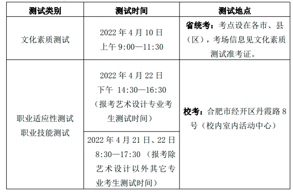 1. 校考缴费:按照安徽省物价部门标准,职业技能测试(或职业适应性测试)每个专业的测试收费标准为 120 元/人。考生可于 4 月 15 日 9:00——4 月