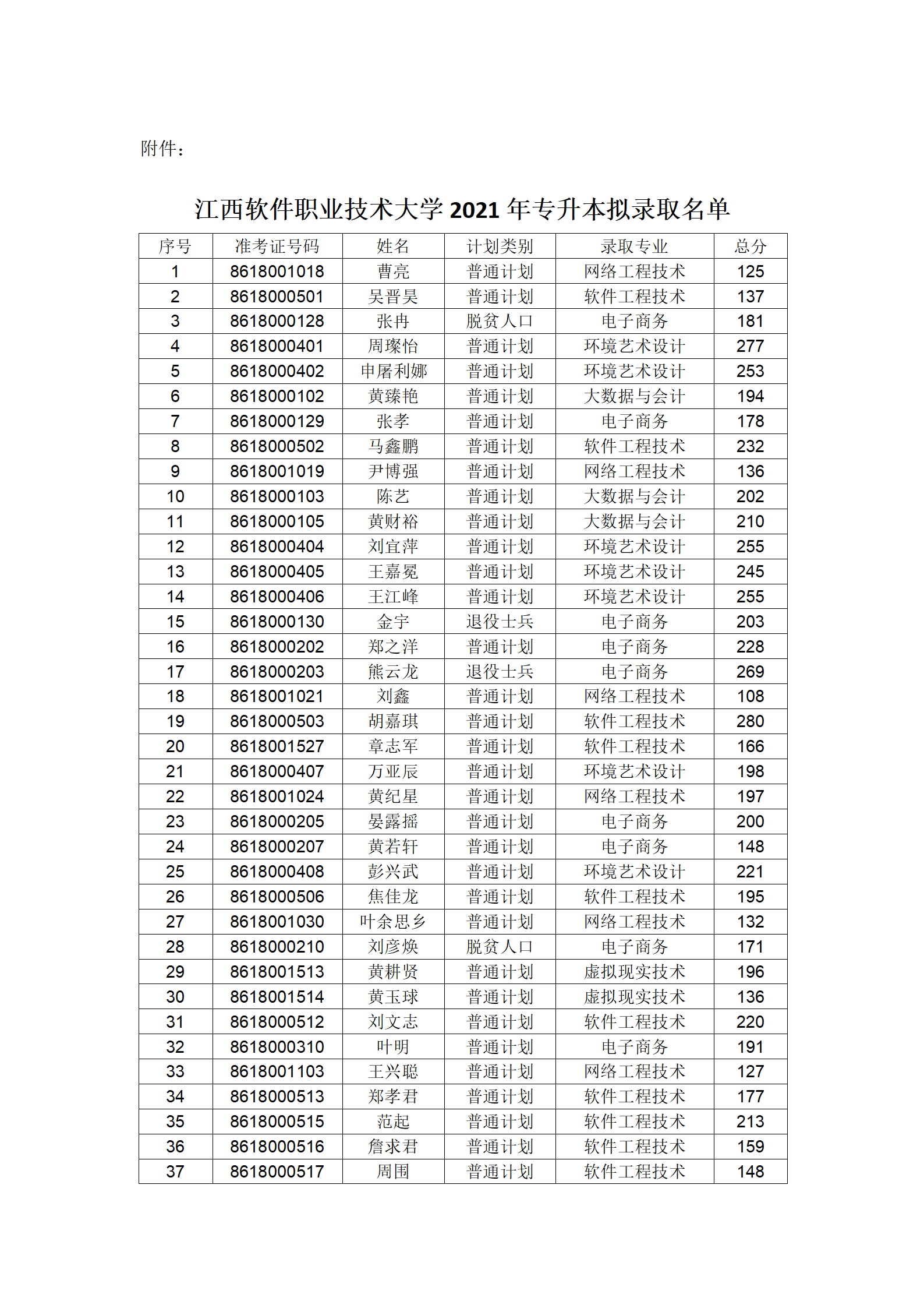 根据江西省教育厅《关于做好全省2021年普通高校专升本考试招生工作的通知》(赣教考字[2021]8号)、《江西软件职业技术大学2021年专升本招生简章》等文件精神,经江西省教育考试院审核通过,现将2021年我校专升本拟录取考生名单予以公示(详见附件)。如有异议,请于6月29日24:00前将存在异议内容的文字说明和本人准考证扫描件发送至494905790@qq.com,逾期不再受理。