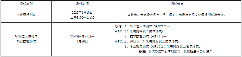 (3)退役军人免文化素质测试,须参加我校组织的职业技能测试(中职毕业生)或职业适应性测试(除中职毕业生以外的其他考生)。