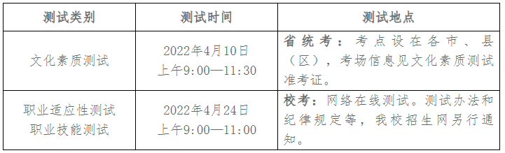 分类考试招生实行“文化素质+职业技能”的考试评价方式。文化素质测试由省教育招生考试院统一组织。文化素质测试合格者,普通高中毕业生参加我校组织的职业适应性测试,中职毕业生参加我校组织的职业技能测试,退役军人、下岗职工、农民工、高素质农民等社会群体考生,根据其中等教育阶段毕业类型(即参加高考报名时的“毕业类别”),参加我校组织的职业适应性测试或职业技能测试。
