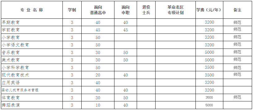 2.面向中职计划:录取遵循“志愿优先”原则,即根据考生的第一专业志愿,按照考生入学测试成绩从高分到低分依次录取,若第一专业志愿无法满足,则根据第二专业志愿从高分到低分依次录取,依此类推,进行后续专业志愿录取。当考生所填报的专业志愿均无法满足时,若填报专业服从志愿,则由学校调剂到有空余计划的专业,若未填报专业服从志愿,则不予录取。录取时,若入学测试成绩相同,则按专业能力测试成绩从高分到低分依次录取。音乐教育专业能力测试相同,则按乐理、视唱练耳、音乐欣赏、中西方音乐史成绩顺序,从高分到低分依次录取;舞蹈表演专业按乐理、舞蹈基础知识、中西方舞蹈史、音乐欣赏成绩顺序,从高分到低分依次录取;美术教育专业按素描基础、色彩基础、美术欣赏、审美素养成绩顺序,从高分到低分依次录取;体育教育专业按田径基础、球类基础、体操基础、体育基础知识成绩顺序,从高分到低分依次录取;学前教育、早期教育、婴幼儿托育服务与管理专业按综合知识、学前教育学、学前心理学、学前卫生学成绩顺序,从高分到低分依次录取;现代教育技术专业按c程序设计语言、计算机网络、计算机基础知识、办公软件成绩顺序,从高分到低分依次录取。