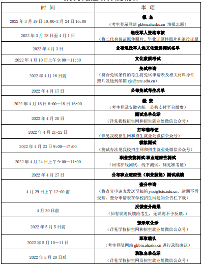 1.学校预录取:2022 年 5 月 5 日前,在我校招生网(http://www.tctc.edu.cn/zjc/)公示被我校预录取考生信息。