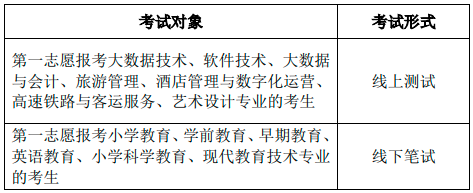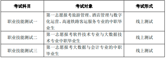分类考试招生实行“文化素质+职业技能”的考试评价方式。文化素质测试由省教育招生考试院统一组织。文化素质测试合格者,普通高中毕业生参加我校组织的职业适应性测试,中职毕业生参加我校组织的职业技能测试,退役军人、下岗职工、农民工、高素质农民等社会群体考生,根据其中等教育阶段毕业类型(即参加高考报名时的“毕业类别”),参加我校组织的职业适应性测试或职业技能测试。
