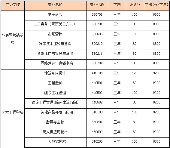 学校占地面积近千亩,是一所“中西合璧、现代典雅、科学合理、环境优美”的新校园,目前学校设有五个二级学院,分别是财经管理学院、外国语学院、互联网营销学院、艺术工程学院、康养护理学院。开设有国际商务、商务英语、会计、酒店管理、高速铁路客运服务、建设工程管理、建筑室内设计、播音与主持、电子商务、幼儿发展与健康管理、眼视光仪器技术等28个专业(含5个专业方向)。
