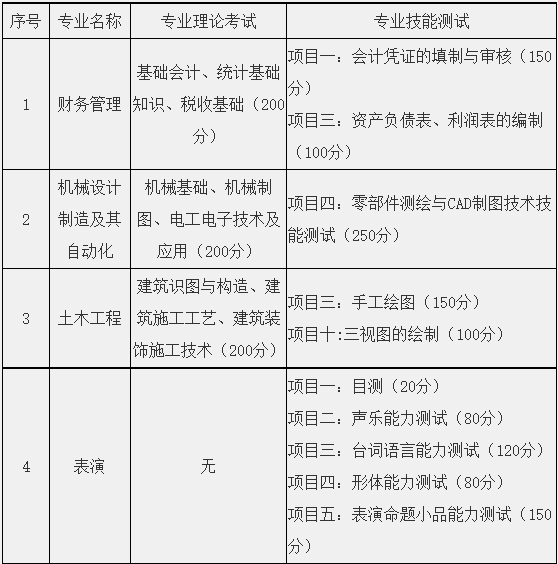 专业理论考试与专业技能测试满分450分,由我校命题、组织考试并阅卷评分。其中财务管理、土木工程、机械设计制造及其自动化、计算机科学与技术、学前教育专业:专业理论考试满分200分,专业技能测试满分250分。表演专业:表演专业只有专业技能测试,满分450分。(具体见下表)