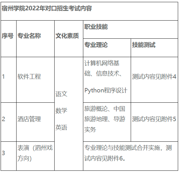 对口招生实行“文化素质+职业技能”的考试评价方式,考试内容以教育部颁布的现行教学大纲为依据。其中,文化素质测试内容参照全省统一的《安徽省普通高校分类考试招生和对口招生文化素质测试考试纲要》执行;专业理论测试及技能测试内容参照《安徽省普通高校对口招生专业理论和技能测试考试纲要》(2022年修订版)执行。