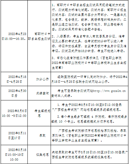 1. 申报我院高职对口中职自主招生的考生(包括“2+3”考生)必须参加广西公办高职高专招生联盟统一组织的联合测试并取得相应成绩。没有参加联合测试的考生,不予录取;