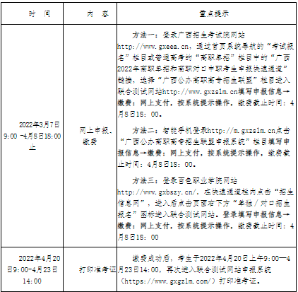方法一:登录“广西招生考试院”网站(https://www.gxeea.cn/),通过首页系统导航的“考试报名”栏目或普通高考的“高职单招”或“高职对口中职”栏目中的“广西2022年高职单招/对口中职申报快速通道”链接,选择“广西公办高职高专院校招生联盟”栏目进入联合测试网站(https://www.gxzslm.cn)填写申报信息。