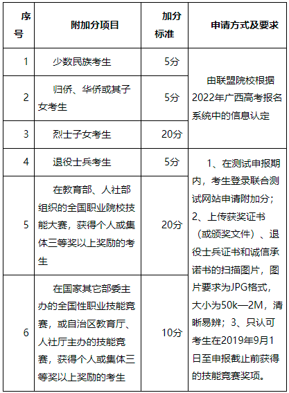 附加分项目及加分标准仅适用于本次联盟院校的高职对口中职自主招生联合测试;②同一考生符合多项加分条件的,只按其中最高一项加分分值计入总分。