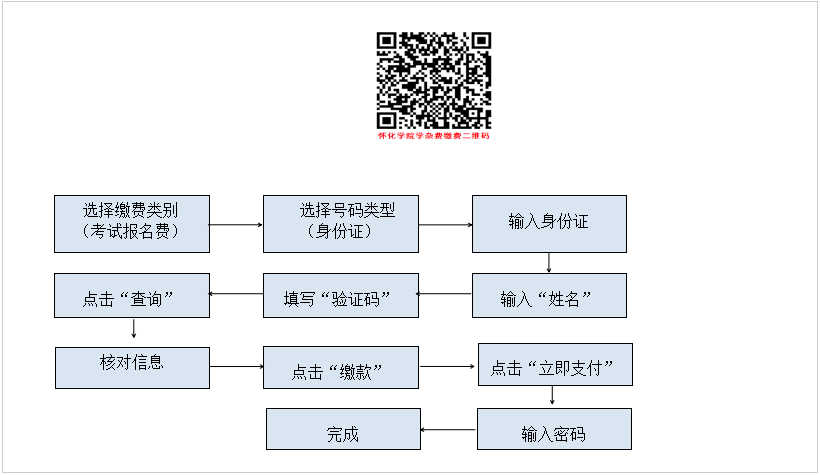 (二)缴费时间:4月14号前完成缴费。具体方法为:专升本报名缴费工作开始后,报名费采用微信、支付宝扫码(怀化学院学杂费缴费二维码)收费,14日24时后系统将自动关闭不能再缴费,需要缴纳专升本考试费的同学在缴费期间内按下面步骤缴费。