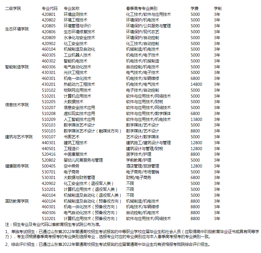 2022年潍坊环境工程职业学院单招与综合评价分类别招生专业