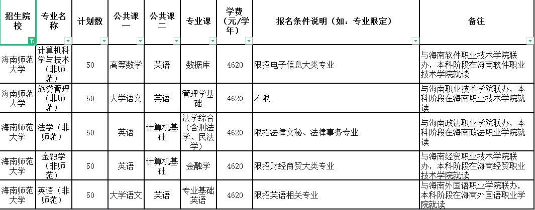 2020年与2021年的海南师范大学专升本专业是相同的,且均与其他院校进行联合培养,专升本新生的就读院校并不在海南师范大学校区内,而是在各个专升本专业的联合培养院校。