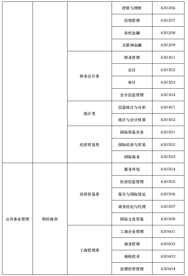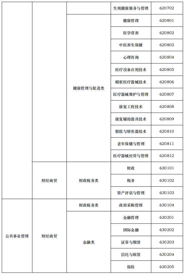 医学检验技术620401、医学生物技术620402、医学影像技术620403、医学美容技术620404、口腔医学技术620405、卫生检验与检疫技术620406、眼视光技术620407、放射治疗技术620408、呼吸治疗技术620409