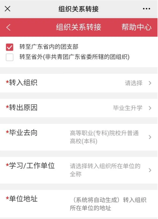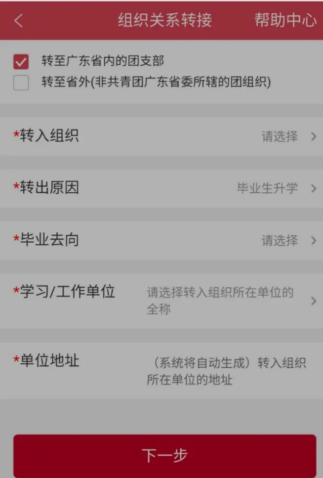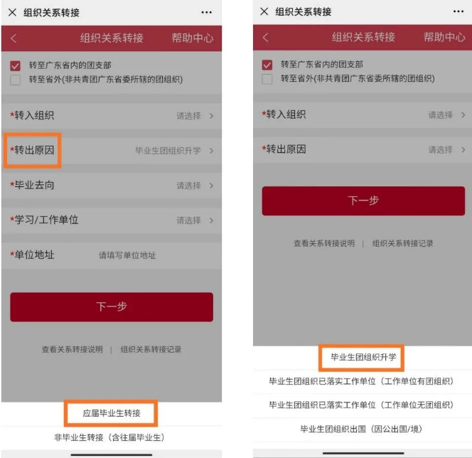 转出原因选择“ 应届毕业生转接 ”,再点击选择“ 毕业生团组织升学 ”