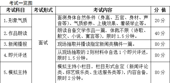 1.形象气质 20分;2.作品朗读 40分;3.新闻播报 80分;4.即兴评述 80分;5.模拟主持 80分。