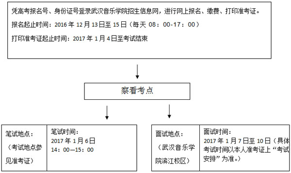 5.考生应于2017年1月5日下午察看熟悉考点,了解有关考试注意事项。考试的相关信息和规定将在湖北省教育考试院网、武汉音乐学院招生信息网和考试现场公告栏公布。如有变化,以考试现场公告为准。