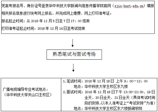 已在高考网报时选报了戏剧与影视学类广播电视编导专业的考生,请于2016年12月5日8:30至12月7日17:00,凭高考报名号及身份证号登录华中科技大学新闻与信息传播学院官网(sjic.hust.edu.cn),填报相关报名信息进行专业科目统考网上报名并完成网上缴费。请考生合理安排时间,务必在规定时间内完成网上报名和网上缴费,网上报名系统关闭后不再安排补报。