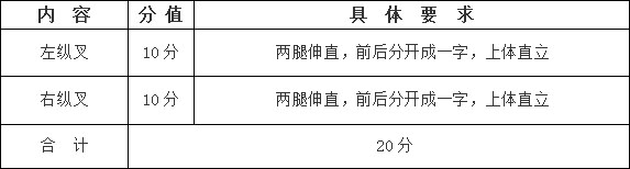 (1)左右竖叉(20分):姿态端正,两腿伸直分开成一字,腿及髋部全部着地、髋位正,膝关节伸直。男生髋关节最下沿离地每2cm扣1分,女生髋关节最下沿离地每1cm扣1分,直至扣完。