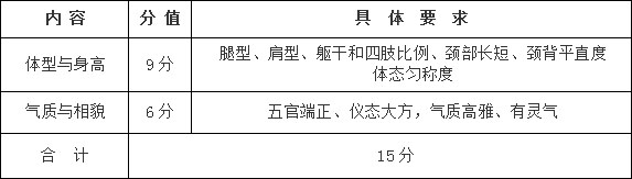 依据考生的五官、身材比例、腿形、肩形、体态进行评分。根据目测的具体情况进行评分。