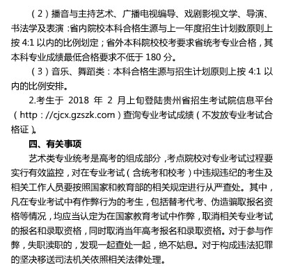 2018年贵州省艺术类专业统考简章 艺考 • 2023-06-19 15:23:36 • 专栏 贵州省2018年普通高校招生艺术类各专业统考简章 本文由用户:艺考 投稿分享,如有侵权请联系我们(点击这里联系)处理,若转载,请注明出处:http://xueli.yktime.cn/37775.html 赞 (0) 艺考 0 生成海报 相关推荐 2018年湖南文理学院艺术类校考成绩查询 湖南文理学院2018年本科招生外省艺术校考成绩查询网址:http://www.huaszj.cn/huaszs/search3.aspx合格考生的校考合格证将于2018年4月下旬左… 专栏 2023-06-19 00 2021东华理工大学专升本录取分数线 专项类考生录取情况 表1 分专业专项考生总成绩录取分数线情况表 普通类考生录取情况 按照录取原则,专项计划未满额的,将专项缺额计划调整为同专业的普通计划进行录取。原定普… 专栏 2023-06-19 00 2018西南交通大学美术类本科拟招生计划 ①招生省份 设计学类招生省份:河北、山西、黑龙江、江苏、安徽、福建、山东、河南、湖南、湖北、四川、贵州、甘肃13个省。 绘画专业招生省份:河北、山西、黑龙江、江苏、安徽、山东、… 专栏 2023-06-19 00 智能交通管理专业学什么,考试科目? 我想请问三本的智能交通工程,学什么,出来做什么,它与电气工程及自动化. 相比于外智能化态化交通系统智能交通整体发展水平比较落《智能交通行业深度调研与投资战略规划析报告》数据显示智能… 专栏 2023-06-19 00 2018年上海外国语大学贤达经济人文学院秋季招生章程 一、学校全称 上海外国语大学贤达经济人文学院 二、就读校址 虹口校区地址为上海市虹口区东体育会路 390 号;崇明校区地址为上海市崇明区东滩大道 999 号。除学前教育和音乐学… 专栏 2023-06-19 00 2018年新疆艺术校考规定 所有报考美术类、音乐类专业的考生必须参加自治区统考,参加自治区统考并获得相应的合格证书的考生方可参加美术类、音乐类专业校考。凡自治区统考涉及到… 专栏 2023-06-19 00 2022年宁夏警官职业学院有自主招生吗? 一、学院简介 宁夏警官职业学院是经自治区人民政府批准设立、教育部备案的专科层次全日制普通高等学校,是全区唯一一所警察类院校。2017年3月,自治区党委、政府决定调整学院管理体制划转… 专栏 2023-06-19 00 湛江科技学院2021年普通专升本征集计划 湛江科技学院2021年普通专升本征集计划 一、征集志愿填报时间 6月23日21:00-6月24日21:00进行考生征集志愿填报,6月24日21:00-23:00不能修改… 专栏 2023-06-19 00 发表回复 您的邮箱地址不会被公开。 必填项已用 * 标注*昵称: *邮箱: 网址: 记住昵称、邮箱和网址,下次评论免输入 提交