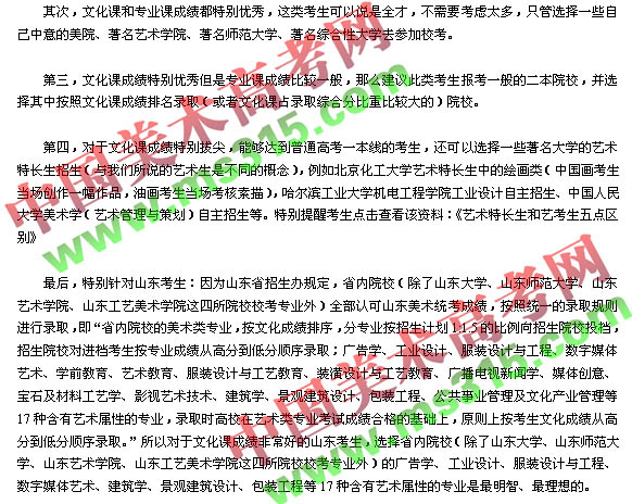 首先,文化课成绩特别优秀但是专业课成绩比较差的的考生。这类考生可以报考一些著名美院,例如中央美术学院(美术学)、清华大学美术学院艺术史论(艺术设计学)、中国美术学院美术与设计理论类专业(含艺术设计学、史论、视觉文化与艺术管理)、西安美术学院美术学(美术史论)、鲁迅美术学院美术学(美术史论、文化传播与管理)、天津美术学院史论类(设计史论、美术史论)、广州美术学院美术史(文科类)、四川美术学院理论类【美术学(美术史论、艺术策划与管理、艺术与文化遗产)、艺术设计学】、湖北美术学院【美术学(史论)、艺术设计学、艺术管理】、山东工艺美术学院史论类(艺术设计学、美术学、广告学)、南京艺术学院【美术学(美术理论)、美术学(文物鉴赏与修复)、艺术设计学(设计理论与策划)、吉林艺术学院美术学(美术馆管理、美术理论与批评、艺术品经营与拍卖、鉴定与修复方向)和、广西艺术学院艺术设计学和美术学(美术史论、文化艺术管理)、云南艺术学院摄影(影视摄影)、新疆艺术学院美术学(美术史论)、北京师范大学数字媒体艺术、上海大学美术学(只对上海招生)、东北师范大学学前教育(只对东北三省招生)、四川大学美术学(史论方向,只面向部分省份招生)等,具体的招生情况请广大考生参考各校当年的艺术类招生简章:http://www.ms315.com/msgk/index.htm