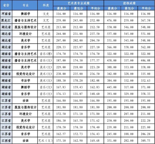 招生专业为美术学、视觉传达与设计、环境设计、服饰与服装设计、动画、书法学、音乐学、舞蹈学、播音与主持艺术9个本科专业;招生省份有湖南、湖北、江苏、甘肃、江西、安徽、福建、山东、河北、山西、内蒙古、四川、贵州、云南、辽宁、河南、广西17个省(自治区),其中山东、湖南、江苏、甘肃、江西5个省组织了艺术类专业校考,校考专业如下: