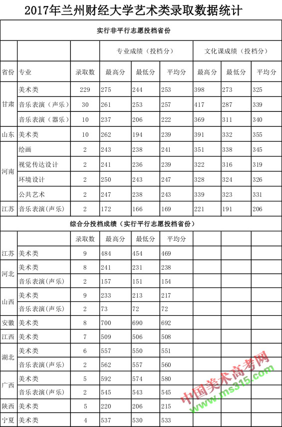 兰州财经大学2017年艺术类本科分省分专业招生计划
