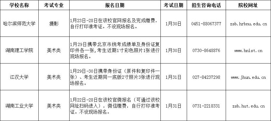 备注:今年,我市继续授权北京城市学院和北京戏曲艺术职业学院两所高校为部分外埠高校在京艺术类专业校考考点,这是我市唯一指定的两所考点校。相关外埠高校的艺术类校考安排请广大考生参阅《北京招生通讯》2018年1月11日第2期特刊内容。