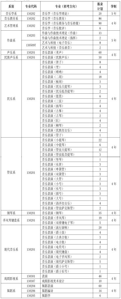 ①美声、民族声乐、笛子、笙、唢呐、二胡、板胡、民乐大提琴、民乐低音提琴、琵琶、三弦、扬琴、古筝、古琴、阮、柳琴、民族打击乐、管子、长笛、单簧管、双簧管、大管、小号、长号、圆号、大号、管弦萨克斯管、管弦低音提琴、西洋打击乐、手风琴、双排键电子琴、流行演唱、现代键盘、现代萨克斯管、爵士小号、爵士长号、爵士鼓、古典吉他、电吉他、电贝司、电子手风琴、音乐教育: