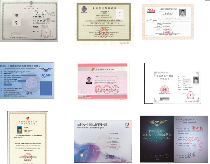 学生在校期间可参加全国统一考试(成人高考),学业期满,考试成绩合格,即可获得国家承认的专科、本科学历文凭(符合条件者可申请学士学位);同时也可根据所学专业,在校考取相应的职业资格证书,如国际航空运输协会(iata)职业资格证书、普通话等级证书、公共英语三级、礼仪证书、英语口语等级证书、安检证书、计算机等级证书、高级文秘证书、多媒体设计师、adobe认证设计”无人驾驶航空器操作手合格证等(以上各项所需费用由学员分别自理)