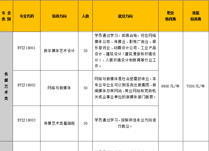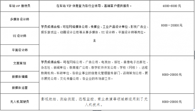 面向全国招收15-22周岁,应、往届初、高中毕业生(含职高、中专、技校、艺校)同等学历者,高端服务管理类需面试、体检合格;传媒艺术类、应用技术类专业需参加综合能力素质测评(有美术、计算机基础者择优录取)