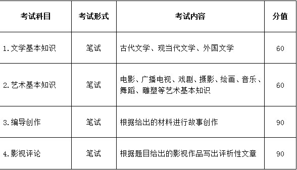 专业总成绩满分为300分,共四科,其中:1.文学基本知识 60分;2.艺术基本知识 60分;3.编导创作 90分;4.影视评论 90分。