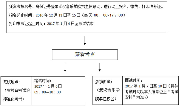 7.考生应于2017年1月6日下午察看熟悉考点,了解有关考试注意事项。考试的相关信息和规定将在湖北省教育考试院网、武汉音乐学院招生信息网和考试现场公告栏公布。如有变化,以考试现场公告为准。