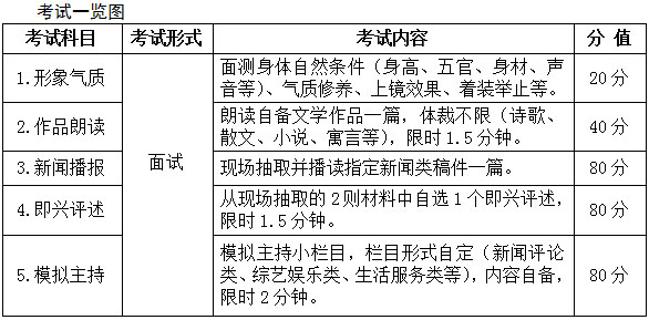 按照广播、电视、网络等电子传媒受众的基本审美标准,综合考察考生的身体自然条件、气质修养、上镜效果、着装举止等情况。